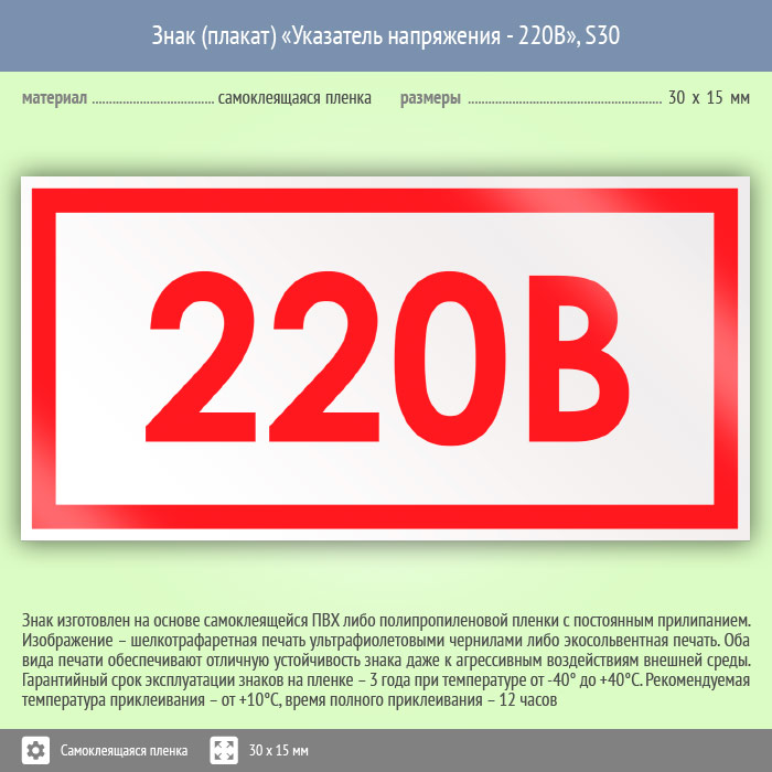 Знак (плакат) «Указатель напряжения - 220В», S30 (50 штук, пленка, 30х15 мм) в Новокузнецке купить