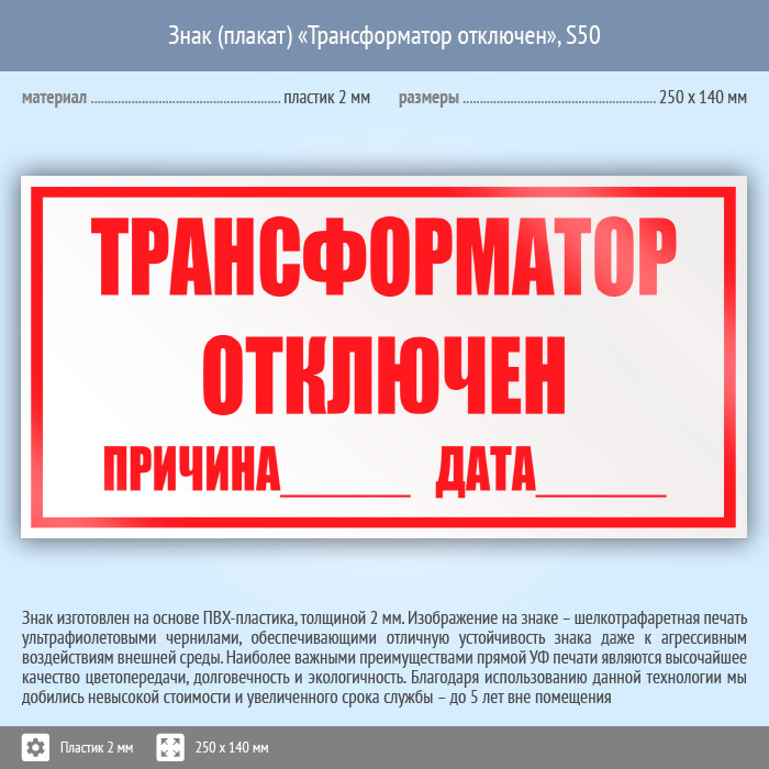 Знак (плакат) «Трансформатор отключен», S50 (пластик, 250х140 мм) в Новокузнецке купить