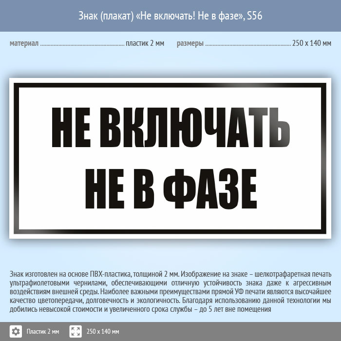 Знак (плакат) «Не включать! Не в фазе», S56 (пластик, 250х140 мм) в Новокузнецке купить