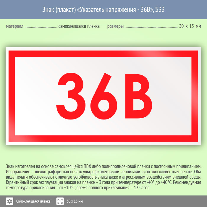 Знак (плакат) «Указатель напряжения - 36В», S33 (50 штук, пленка, 30х15 мм) в Новокузнецке купить