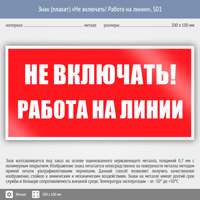 Знак (плакат) «Не включать! Работа на линии», S01 (металл, 200х100 мм) в Новокузнецке купить