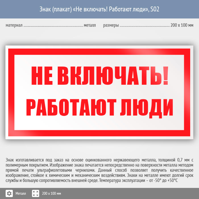 Знак (плакат) «Не включать! Работают люди», S02 (металл, 200х100 мм) в Новокузнецке купить
