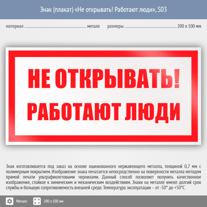 Знак (плакат) «Не открывать! Работают люди», S03 (металл, 200х100 мм) в Новокузнецке купить