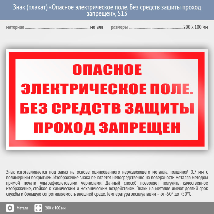 Знак (плакат) «Опасное электрическое поле. Без средств защиты проход запрещен», S13 (металл, 200х100 мм) в Новокузнецке купить