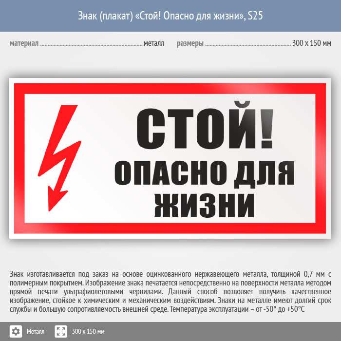 Знак (плакат) «Стой! Опасно для жизни», S25 (металл, 300х150 мм) в Новокузнецке купить