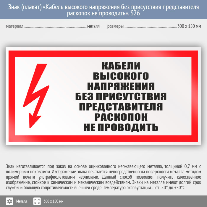 Знак (плакат) «Кабель высокого напряжения без присутствия представителя раскопок не проводить», S26 (металл, 300х150 мм) в Новокузнецке купить