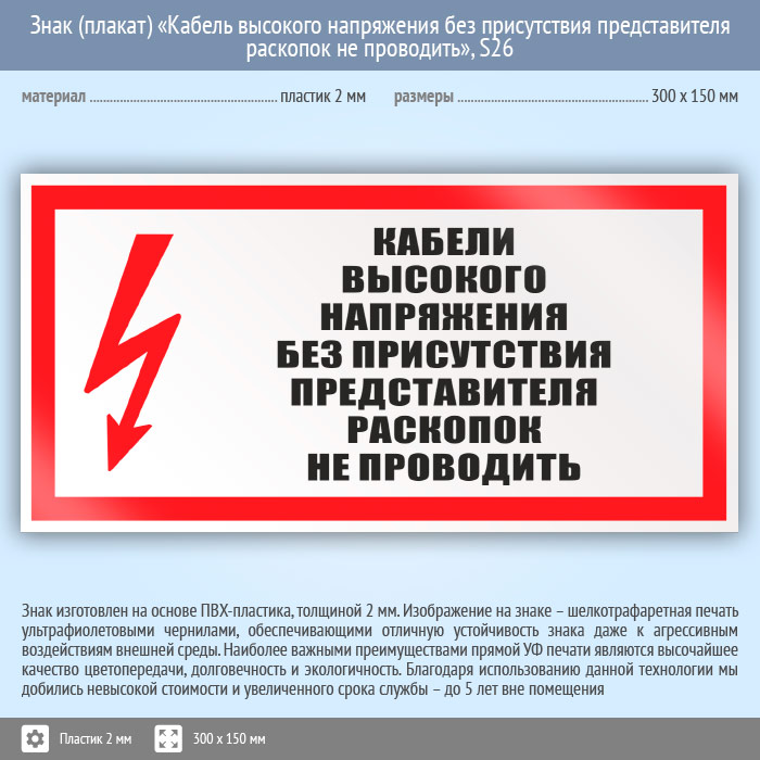 Знак (плакат) «Кабель высокого напряжения без присутствия представителя раскопок не проводить», S26 (пластик, 300х150 мм) в Новокузнецке купить