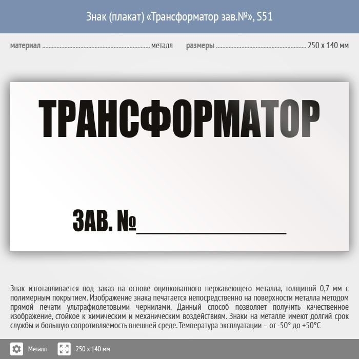 Знак (плакат) «Трансформатор зав.№», S51 (металл, 250х140 мм) в Новокузнецке купить