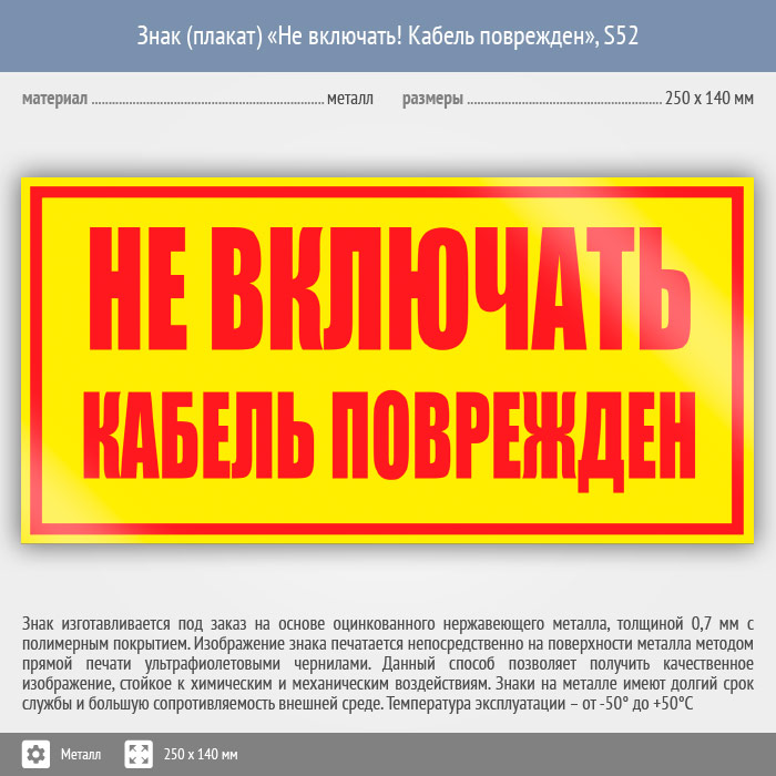 Знак (плакат) «Не включать! Кабель поврежден», S52 (металл, 250х140 мм) в Новокузнецке купить