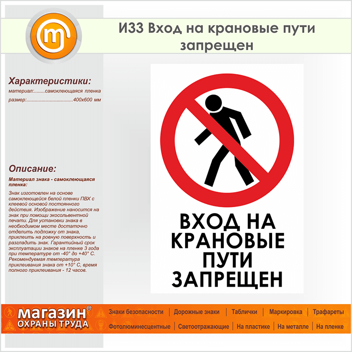 Знак «Вход на крановые пути запрещен», И33 (пленка, 400х600 мм) в Новокузнецке купить
