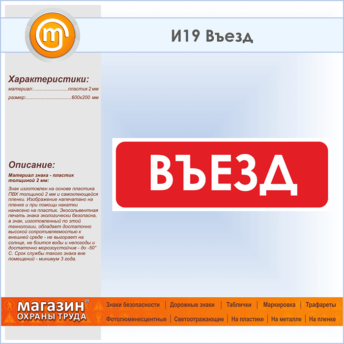 Знак «Въезд», И19 (пластик, 600х200 мм) в Новокузнецке купить
