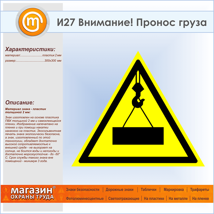 Знак «Внимание! Пронос груза», И27 (пластик, сторона 300 мм) в Новокузнецке купить