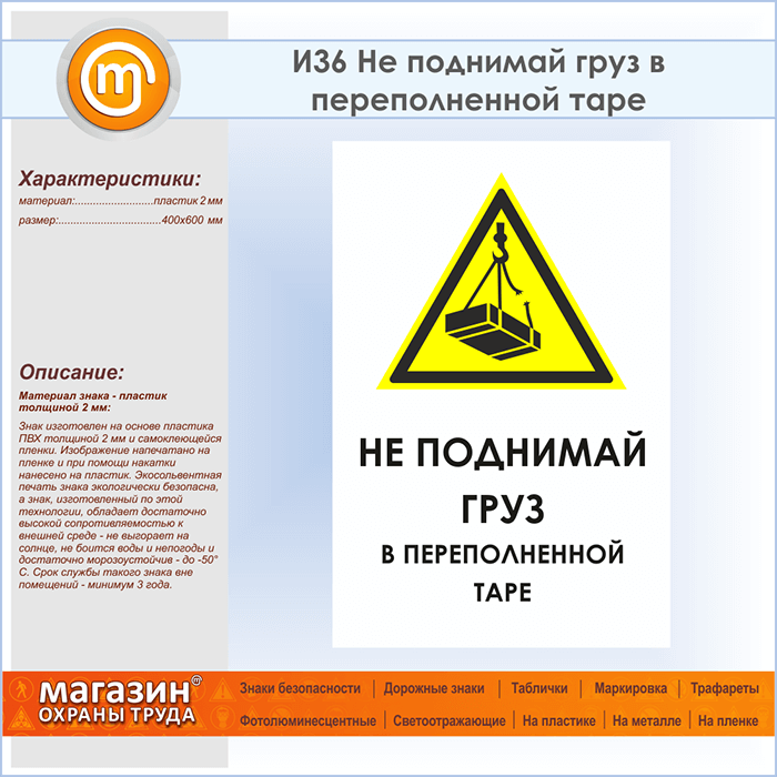 Знак «Не поднимай груз в переполненной таре», И36 (пластик, 400х600 мм) в Новокузнецке купить