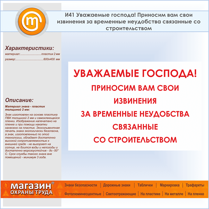 Знак «Уважаемые господа! Приносим вам свои извинения за временные неудобства, связанные со строительством», И41 (пластик, 600х400 мм) в Новокузнецке купить