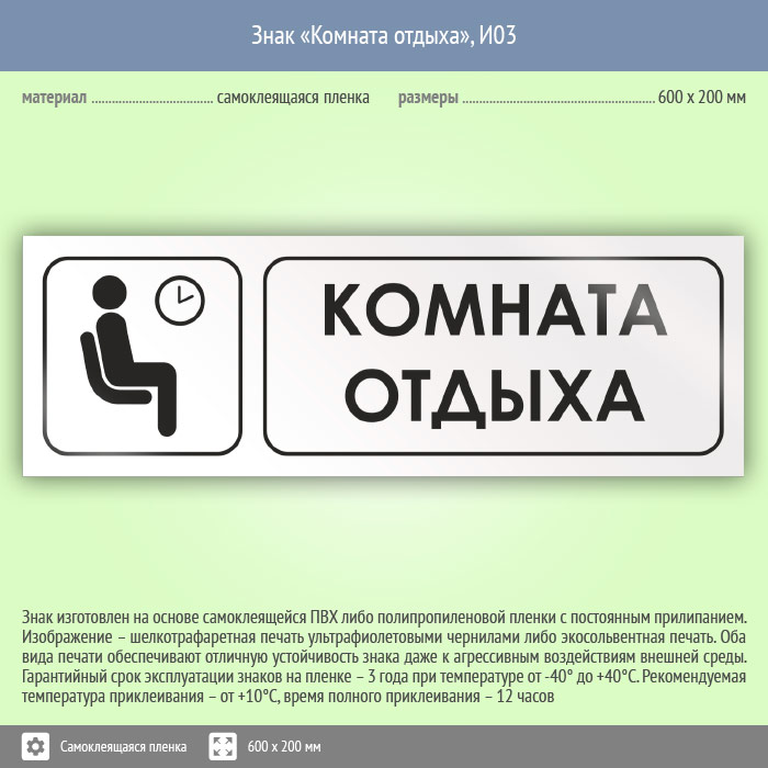 Знак «Комната отдыха», И03 (пленка, 600х200 мм) в Новокузнецке купить