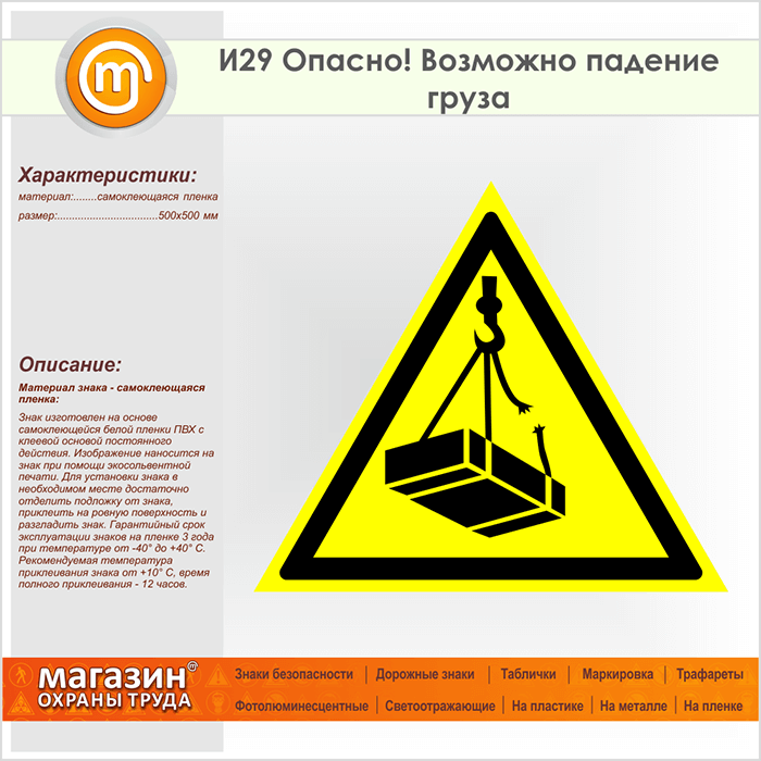 Знак «Опасно! Возможно падение груза», И29 (пленка, сторона 500 мм) в Новокузнецке купить
