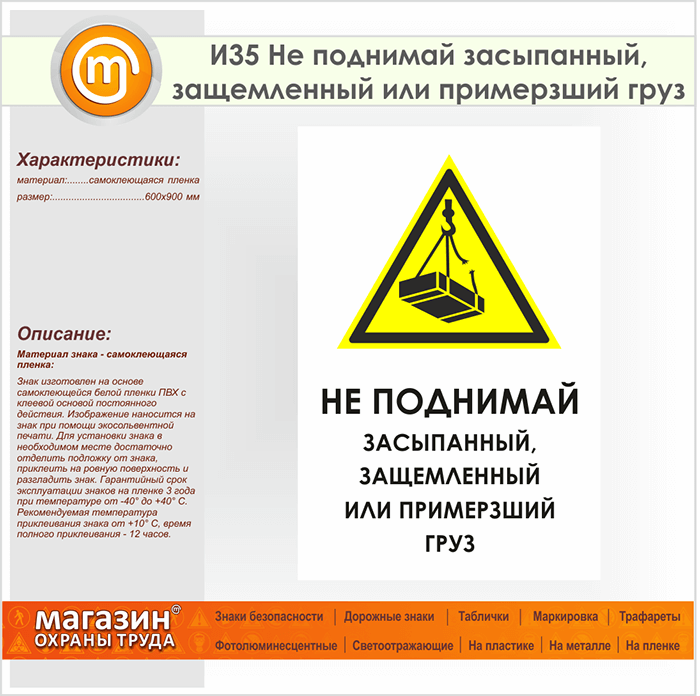 Знак «Не поднимай засыпанный, защемленный или примерзший груз», И35 (пленка, 600х900 мм) в Новокузнецке купить