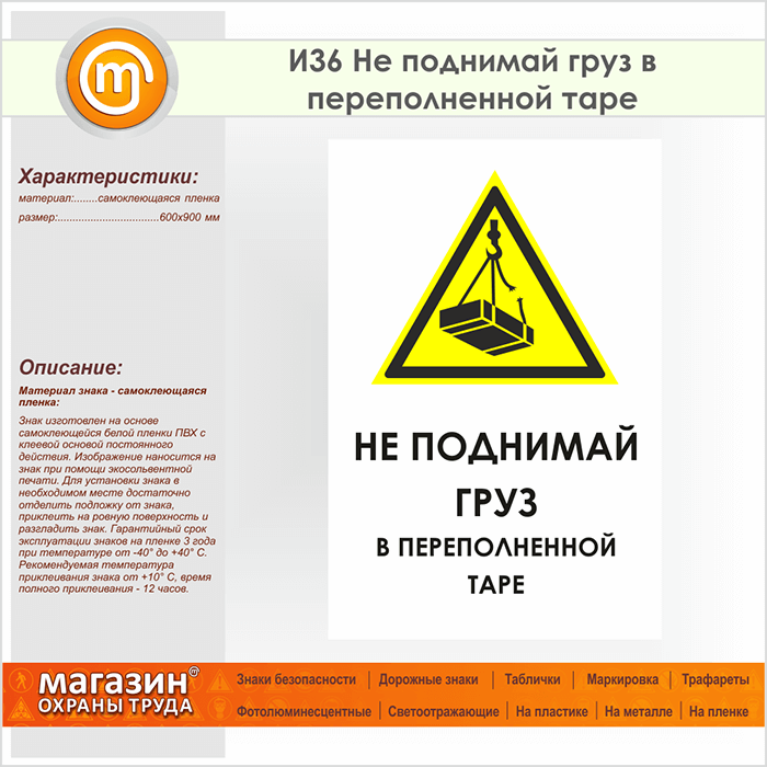 Знак «Не поднимай груз в переполненной таре», И36 (пленка, 600х900 мм) в Новокузнецке купить