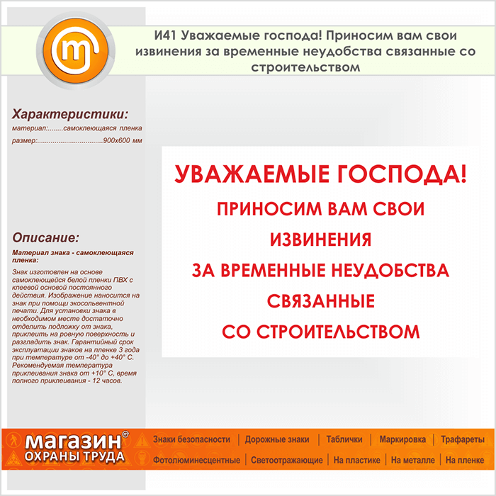 Знак «Уважаемые господа! Приносим вам свои извинения за временные неудобства, связанные со строительством», И41 (пленка, 900х600 мм) в Новокузнецке купить