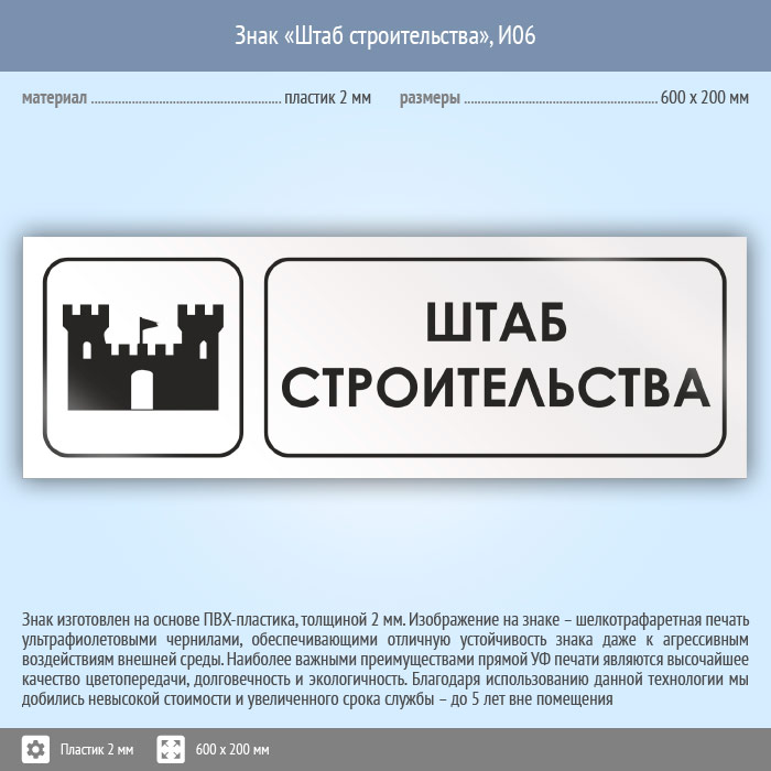 Знак «Штаб строительства», И06 (пластик, 600х200 мм) в Новокузнецке купить