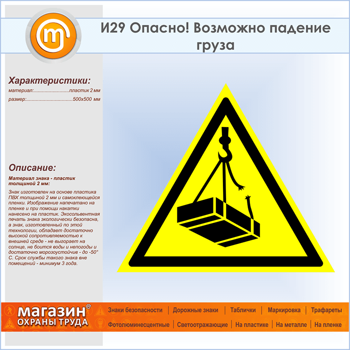 Знак «Опасно! Возможно падение груза», И29 (пластик, сторона 500 мм) в Новокузнецке купить