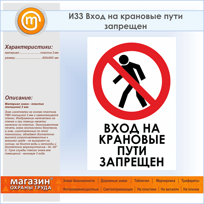 Знак «Вход на крановые пути запрещен», И33 (пластик, 600х900 мм) в Новокузнецке купить