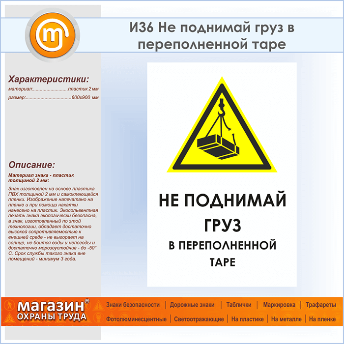 Знак «Не поднимай груз в переполненной таре», И36 (пластик, 600х900 мм) в Новокузнецке купить