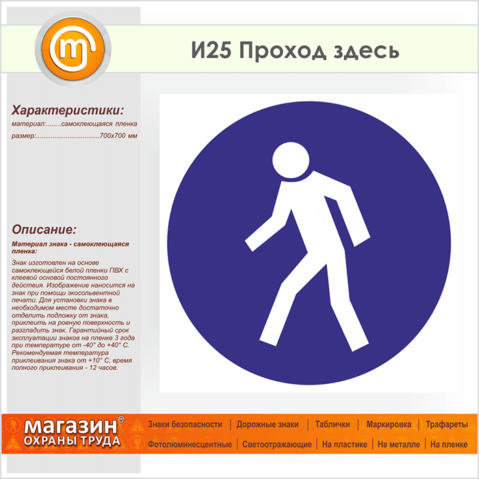 Знак «Проход здесь», И25 (пленка, 700х700 мм) в Новокузнецке купить