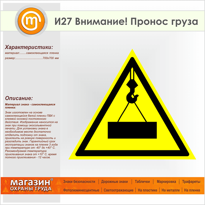 Знак «Внимание! Пронос груза», И27 (пленка, сторона 700 мм) в Новокузнецке купить