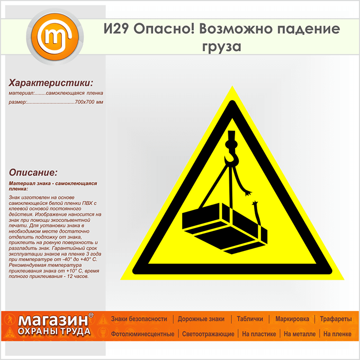 Знак «Опасно! Возможно падение груза», И29 (пленка, сторона 700 мм) в Новокузнецке купить