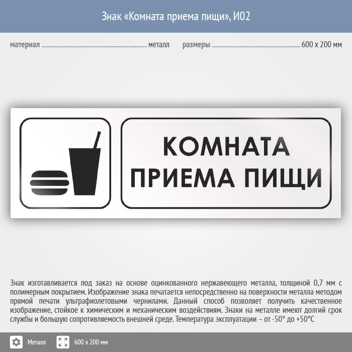Знак «Комната приема пищи», И02 (металл, 600х200 мм) в Новокузнецке купить