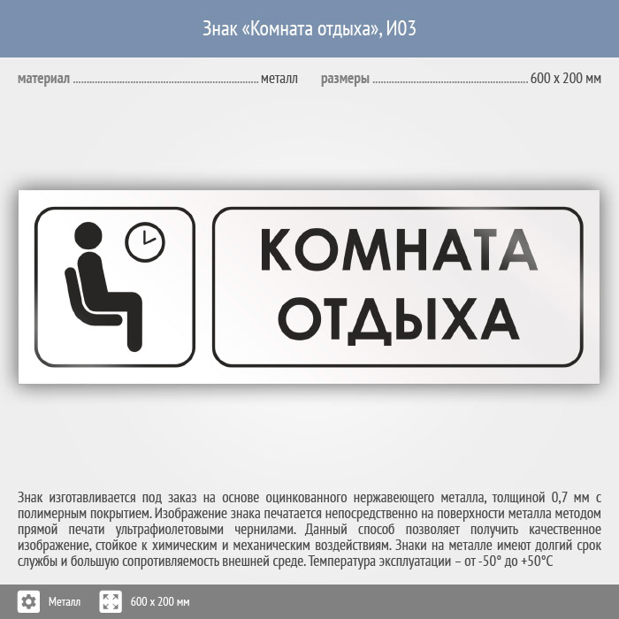 Знак «Комната отдыха», И03 (металл, 600х200 мм) в Новокузнецке купить