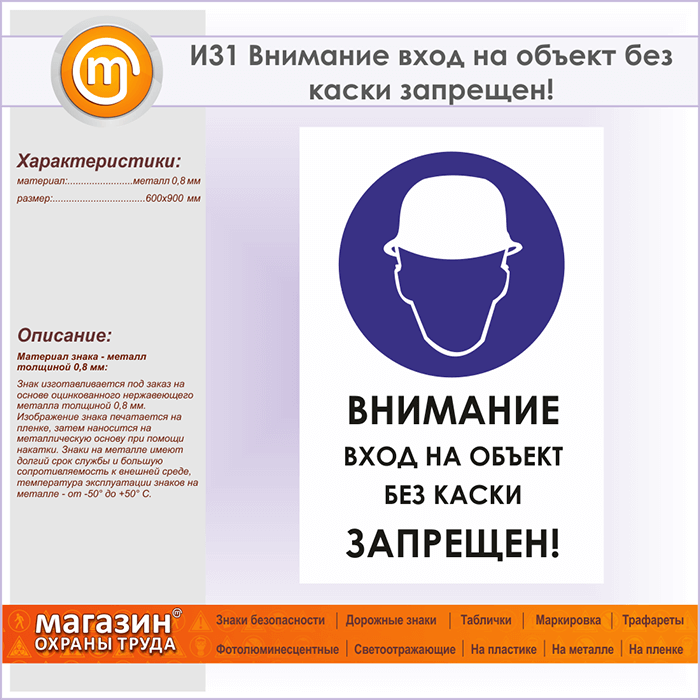 Знак «Внимание вход на объект без каски запрещен!», И31 (металл, 600х900 мм) в Новокузнецке купить