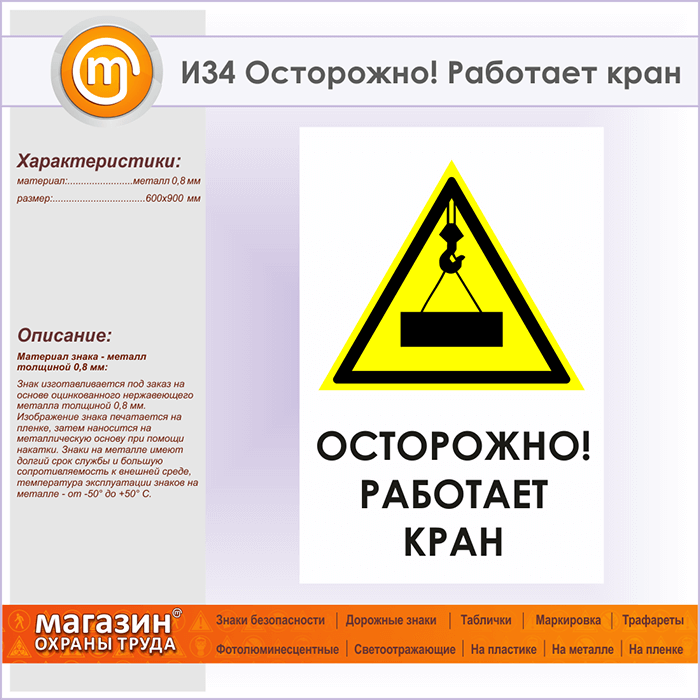Знак «Осторожно! Работает кран», И34 (металл, 600х900 мм) в Новокузнецке купить