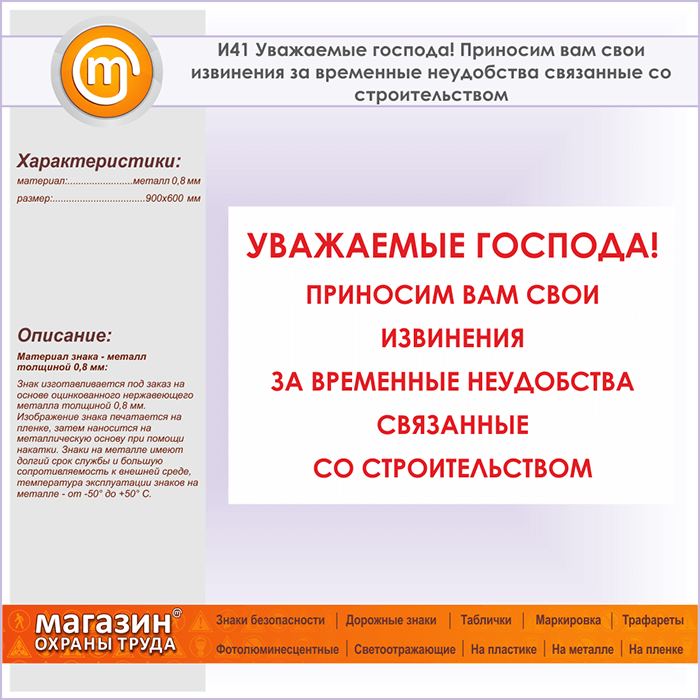 Знак «Уважаемые господа! Приносим вам свои извинения за временные неудобства, связанные со строительством», И41 (металл, 900х600 мм) в Новокузнецке купить