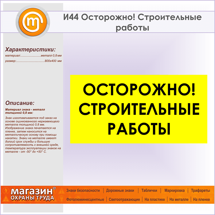 Знак «Осторожно! Строительные работы», И44 (металл, 800х400 мм) в Новокузнецке купить