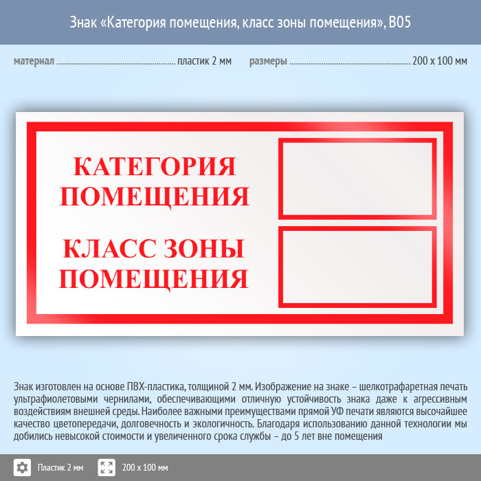 Знак «Категория помещения, класс зоны помещения», B05 (пластик, 200х100 мм) в Новокузнецке купить