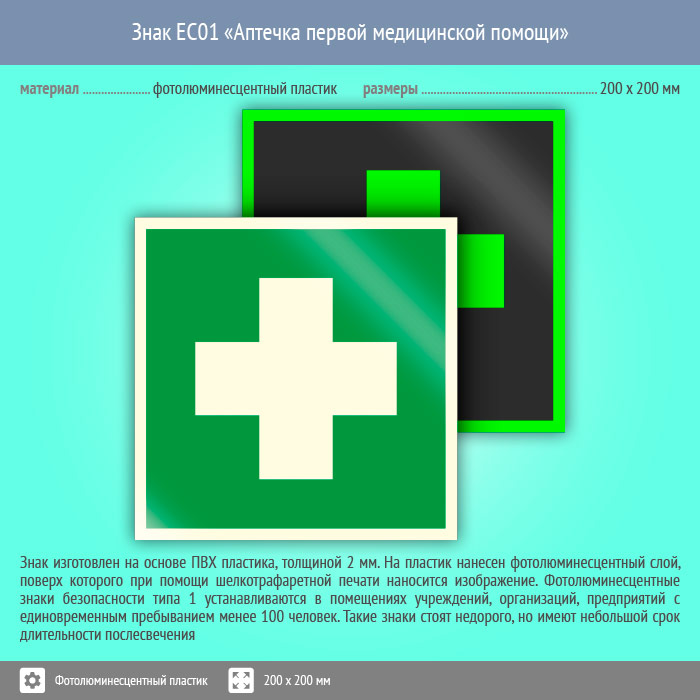 Знак EC01 «Аптечка первой медицинской помощи» (фотолюминесцентный пластик, 200х200 мм) в Новокузнецке купить