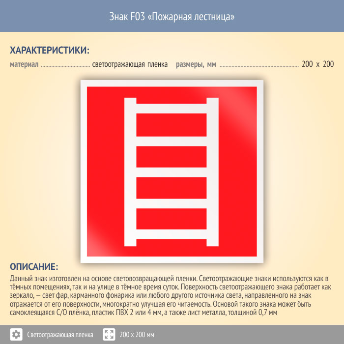 Знак F03 «Пожарная лестница» (светоотражающая пленка, 200х200 мм) в Новокузнецке купить