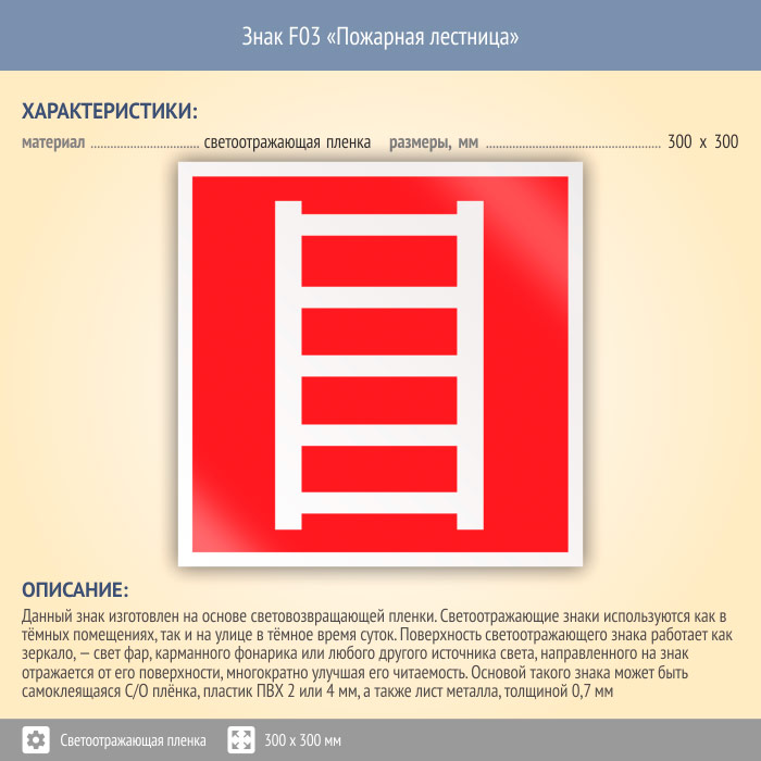 Знак F03 «Пожарная лестница» (светоотражающая пленка, 300х300 мм) в Новокузнецке купить