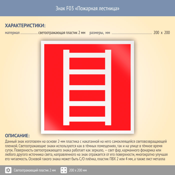 Знак F03 «Пожарная лестница» (светоотражающий пластик, 200х200 мм) в Новокузнецке купить