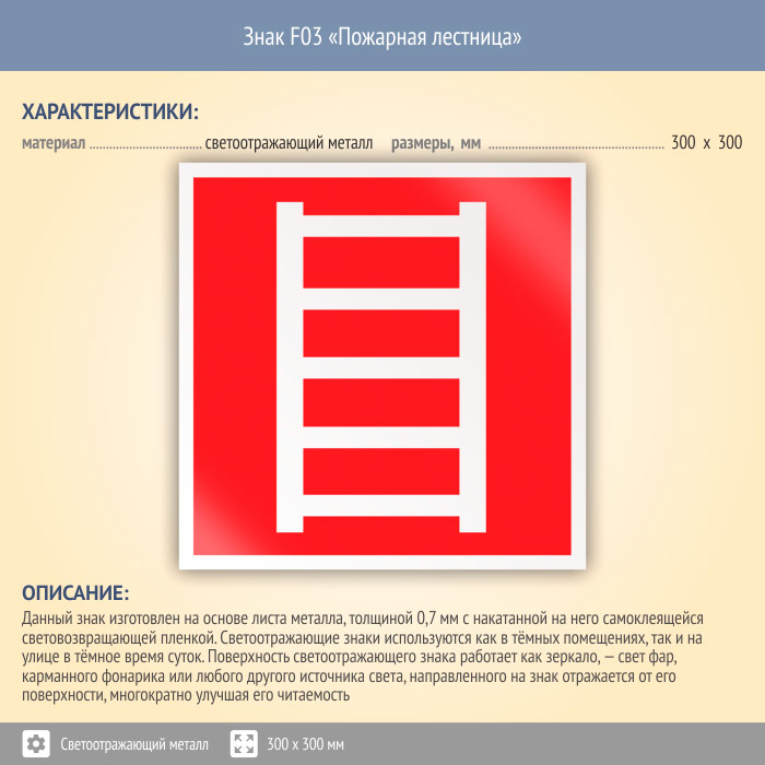 Знак F03 «Пожарная лестница» (светоотражающий металл, 300х300 мм) в Новокузнецке купить