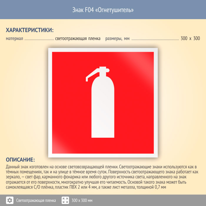 Знак F04 «Огнетушитель» (светоотражающая пленка, 300х300 мм) в Новокузнецке купить