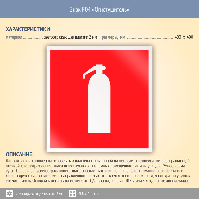 Знак F04 «Огнетушитель» (светоотражающий пластик, 400х400 мм) в Новокузнецке купить