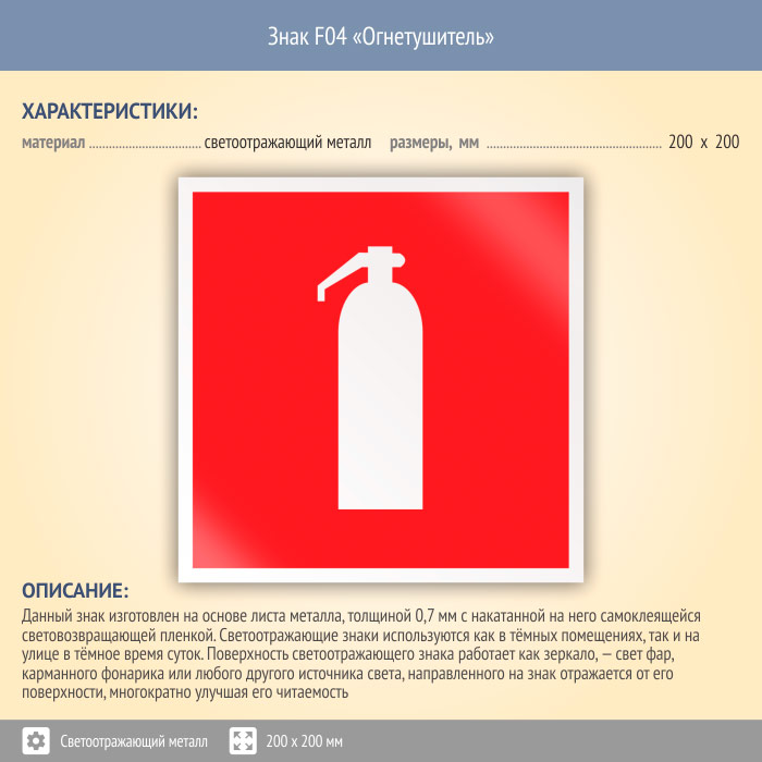 Знак F04 «Огнетушитель» (светоотражающий металл, 200х200 мм) в Новокузнецке купить