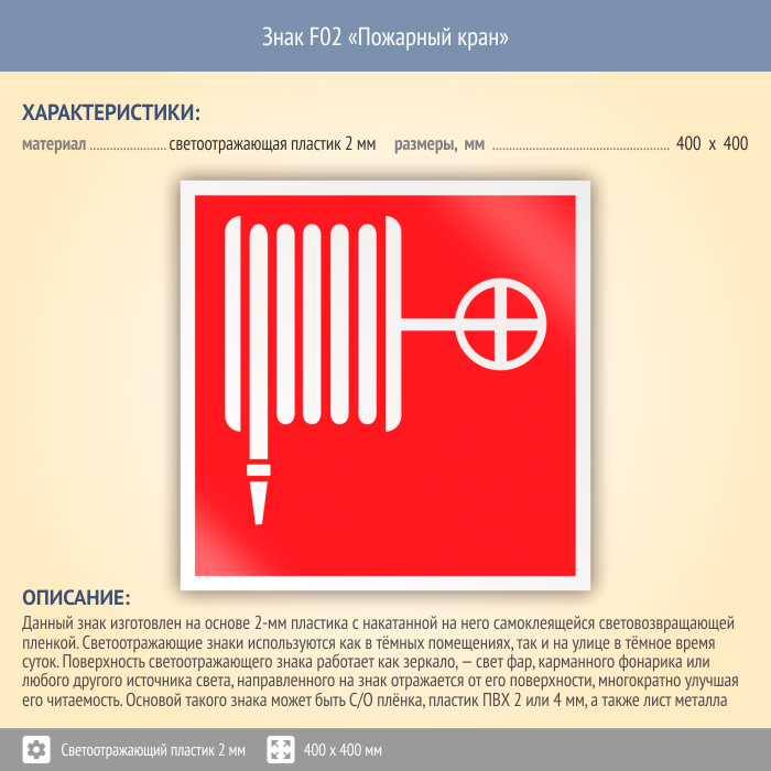 Знак F02 «Пожарный кран» (светоотражающий пластик, 400х400 мм) в Новокузнецке купить