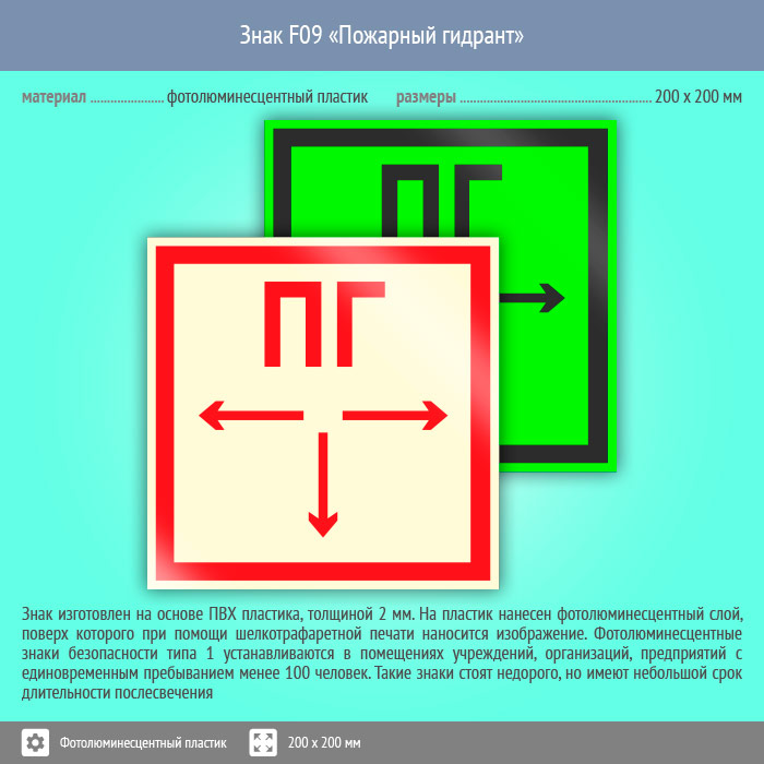 Знак F09 «Пожарный гидрант» (фотолюминесцентный пластик, 200х200 мм) в Новокузнецке купить