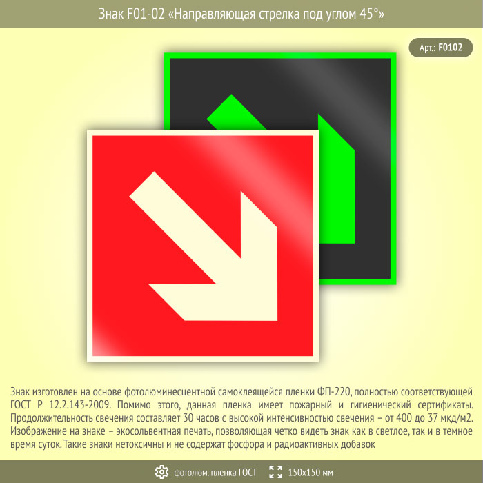 Знак F01-02 «Направляющая стрелка под углом 45°» (фотолюминесцентная пленка ГОСТ 34428-2018, 150х150 мм) в Новокузнецке купить
