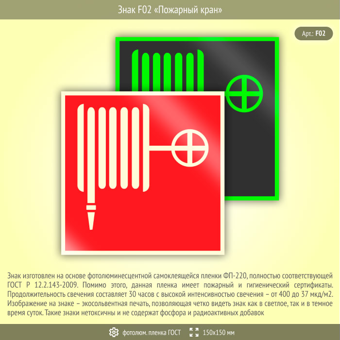 Знак F02 «Пожарный кран» (фотолюминесцентная пленка ГОСТ 34428-2018, 150х150 мм) в Новокузнецке купить