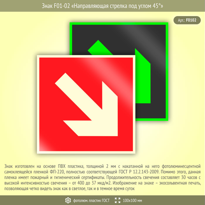 Знак F01-02 «Направляющая стрелка под углом 45°» (фотолюминесцентный пластик ГОСТ 34428-2018, 100х100 мм) в Новокузнецке купить